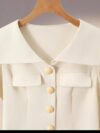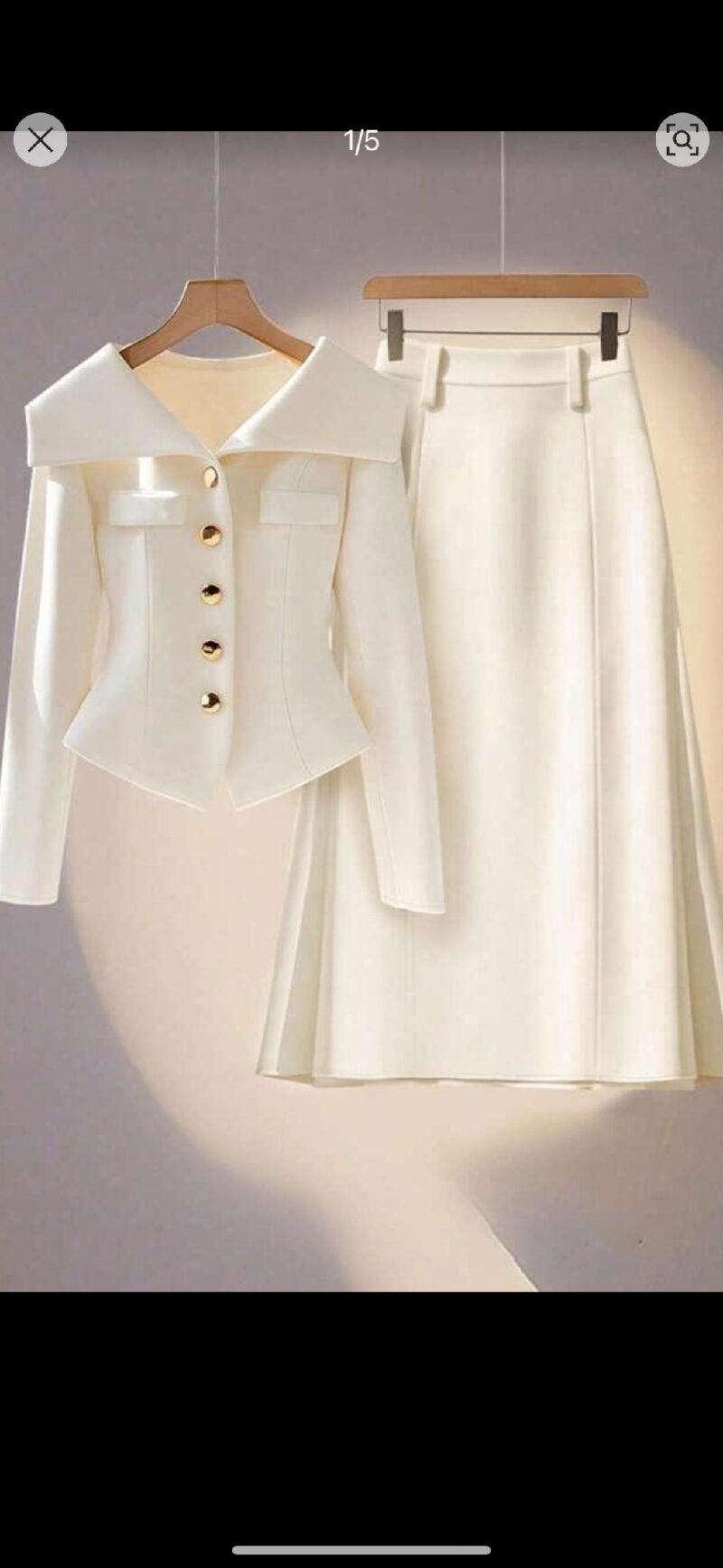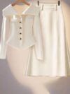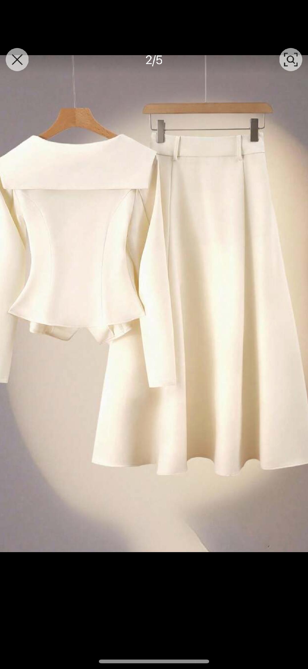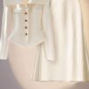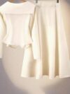 This 2-piece set features a fishtail silhouette, characterized by a fitted bodice that flares out into a flared, curved shape, reminiscent of a mermaid’s tail. The cinching detail at the waist accentuates the wearer’s curves, creating a feminine and sophisticated look.